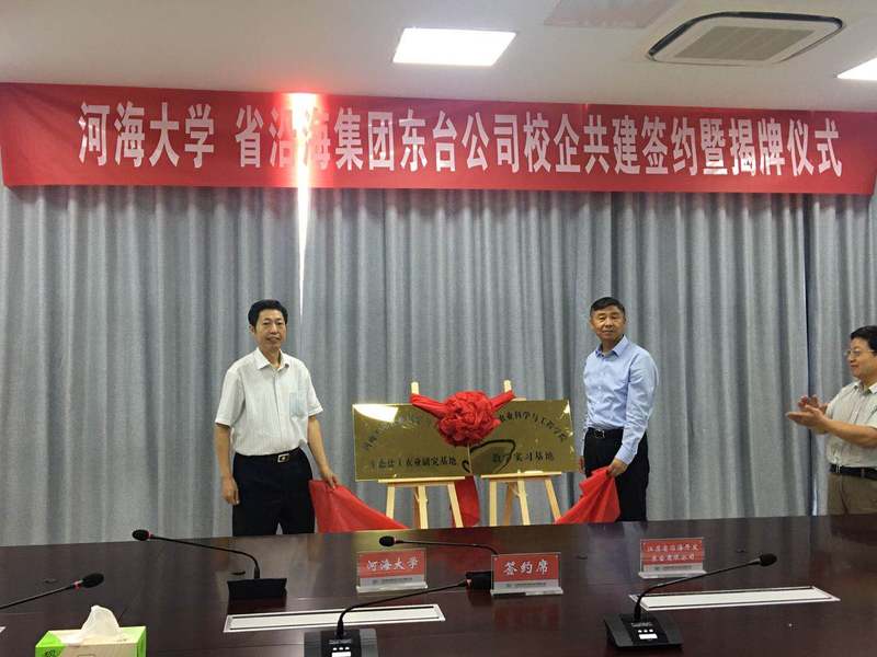 6月19日,88858cc永利官网与江苏省沿海集团东台公司举行产学研合作签约暨生态盐土农业研究基地与教学实习基地揭牌仪式。江苏省沿海集团东台公司殷建祥总经理,端敏副总经理,工程部陈杰峰经理,88858cc永利官网农工院朱成立副院长、徐俊增副院长、郭相平教授、陈立华副教授,江苏省农业农村厅耕地质量与农业环境保护站殷广德首席专家,南京农业大学赵耕毛教授等人出席揭牌仪式。朱成立副院长与殷建祥总经理分别致辞并共同为生态盐土农业研究基地与教学实习基地揭牌,朱成立副院长与端敏副总经理签署合作协议。