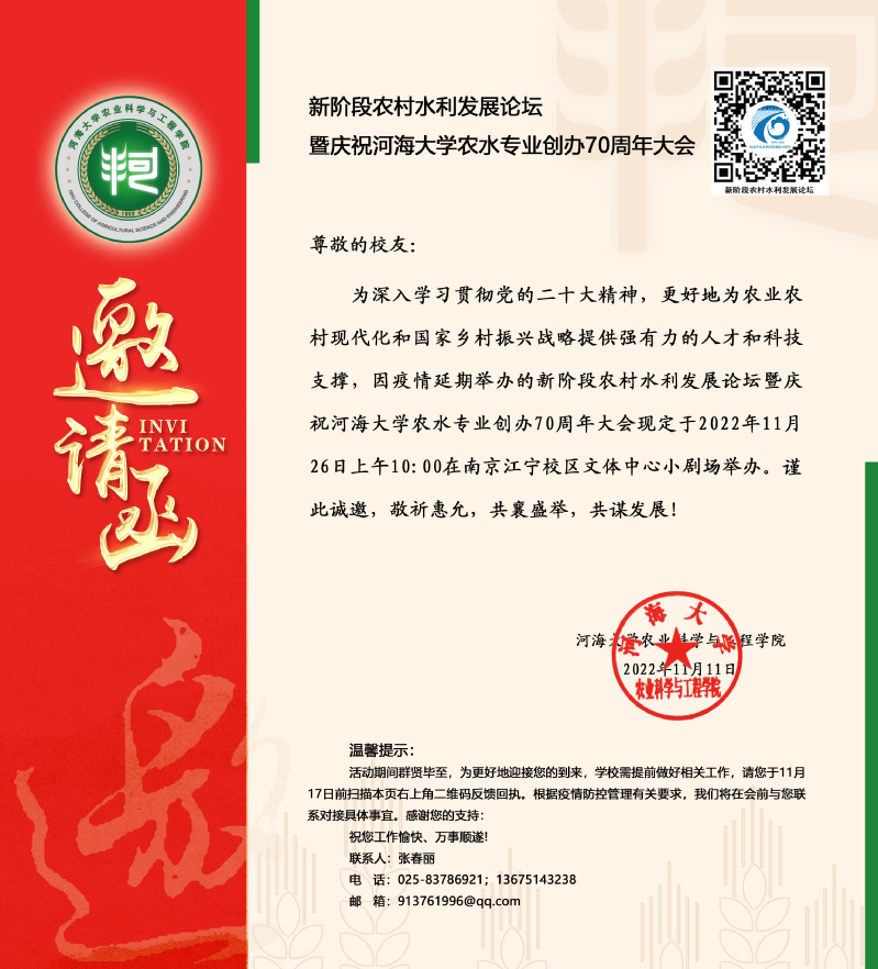 新阶段农村水利发展论坛暨庆祝88858cc永利官网农水专业创办70周年大会邀请函